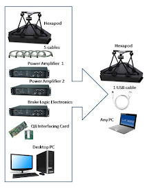 The system has been made much more compact: all power amplification, brake logic, data acquisition and interfacing electronics have been moved into the base of the Hexapod. Whereas the original device required a separate Q8 interfacing card, two large rack-mount amplifiers with a set of five thick cables, all you need is now is a single USB cable to connect the Hexapod to your QUARC-enabled PC or laptop.